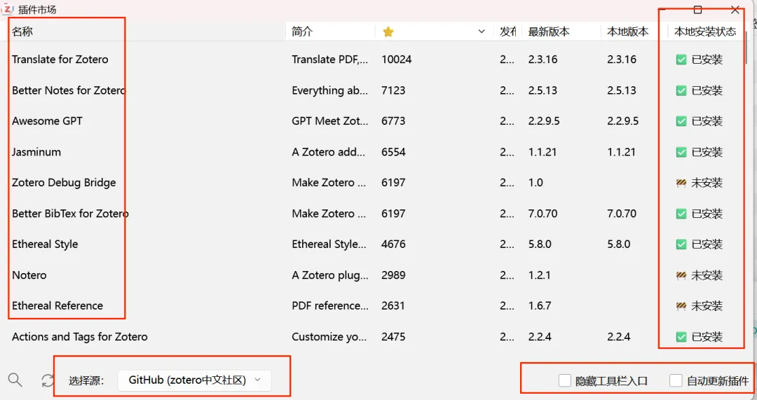核心价值:为您提供一个集成化的插件商店,所有推荐插件均可在此一键发现、下载与管理,极大降低了插件使用的门槛,是您开启 Zotero 进阶之旅的第一步。