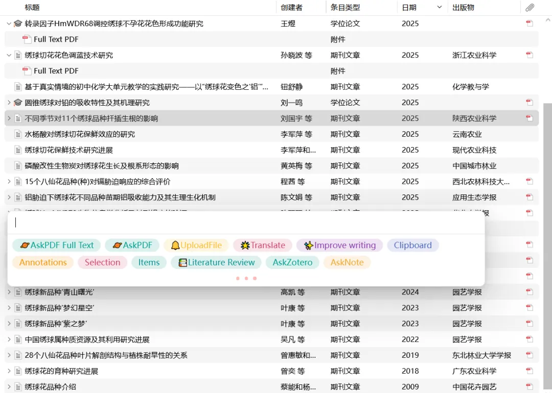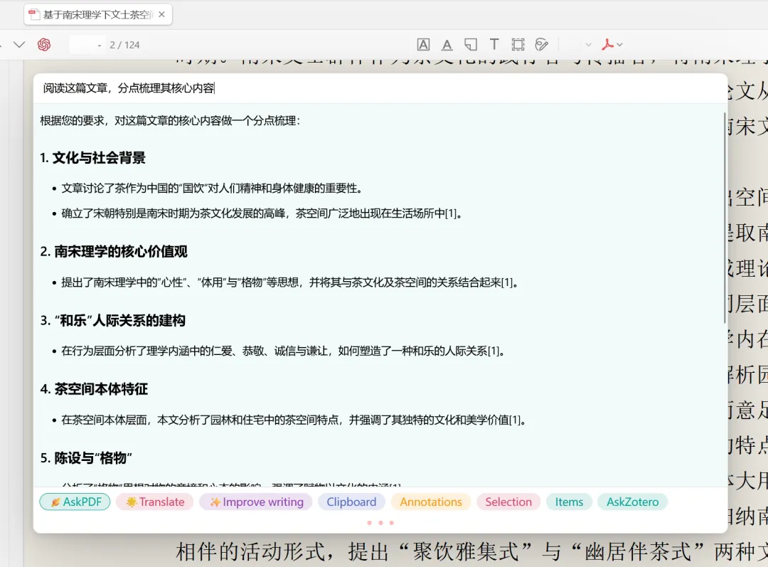 4、选择自己想要阅读的文献,然后点击GPT,可以在搜索栏中打字问问题,也可以选择下面的选项,例如“AskPDF Full Text”是对文献全文内容进行概括,“AskPDF”是对PDF中选中的部分进行提问,“Translate”对文献内容进行翻译。“Improve writing”对文本进行润色,优化文本或者是调整语言逻辑。“Literature Review”是这是自动生成文献综述,比如说我们选中zotero中的多篇文献,整合文章的核心内容和研究脉络、结论差异等,去快速产生综述性内容。