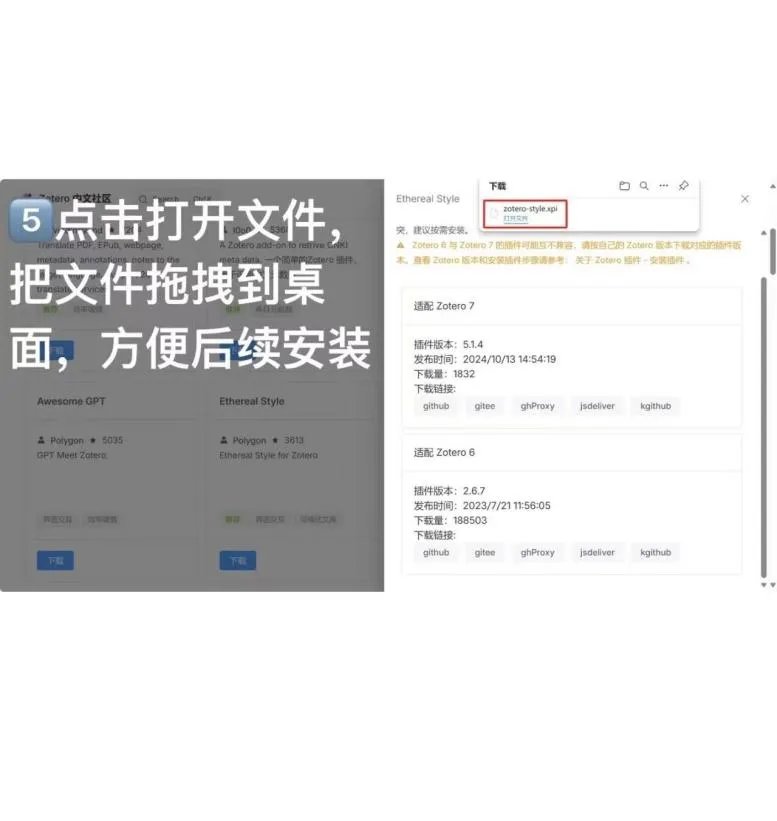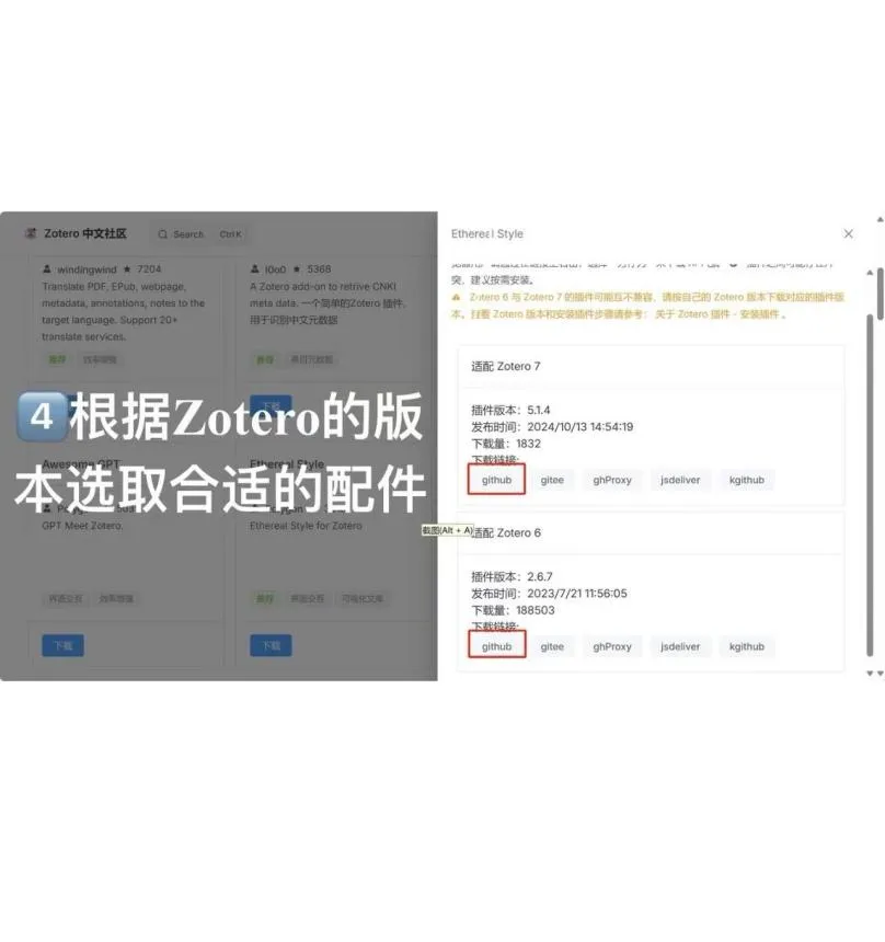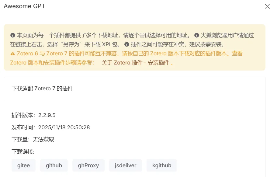 1、搜索Zotero插件商店,找到Awesome GPT插件,点击下载,选择下载链接例如“github”,将下载好的插件直接拖入到zotero工具—插件当中。