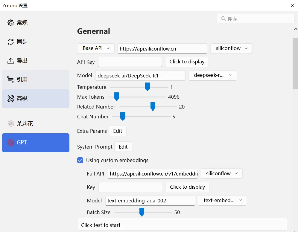 2、点击“编辑—设置—Awesome GPT”,进行配置。模型可以选择以上两个。Full API选择siliconflow。Base API选择siliconflow。API Key和Key我们在之前的操作中已经选择了硅基流动,可以通过注册或者登录硅基流动,左侧账户管理中找到API 密钥然后新建API 密钥即可,将生成的密钥粘贴到zotero中。找到Tip:pro的模型是收费的。