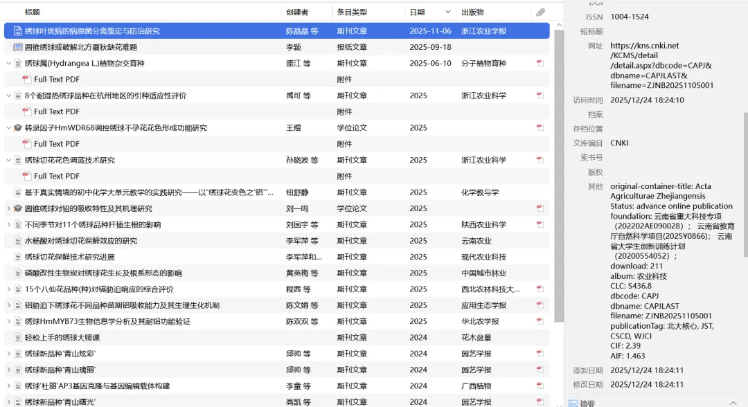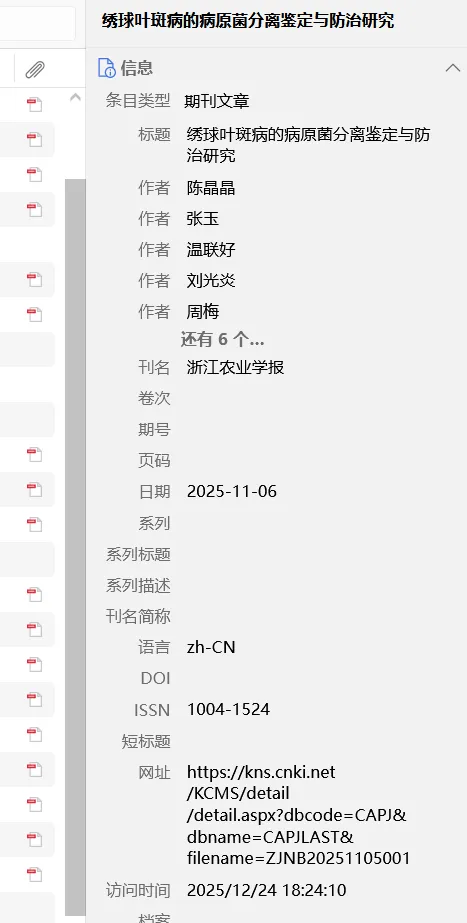 3、完成更新后,可以在zotero当中检查,是否有提取到PDF的符号。也可以参考作者姓名格式是否和中文正常书写一致。另外也可以通过日期是否具体和其他这一栏中是否有丰富的数据来判断是否安装成功了。Tip:更新完Translator后就算把茉莉花插件禁用,依然可以捕获成功。