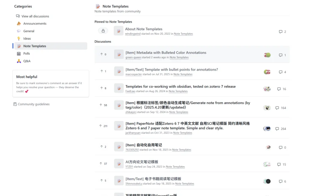 (https://github.com/windingwind/zotero-better-notes/discussions/categories/note-templates)