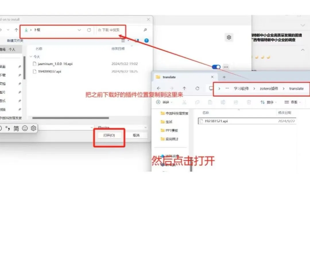 在弹出的文件选择窗口中,选中下载好的 .xpi 文件,点击 打开。