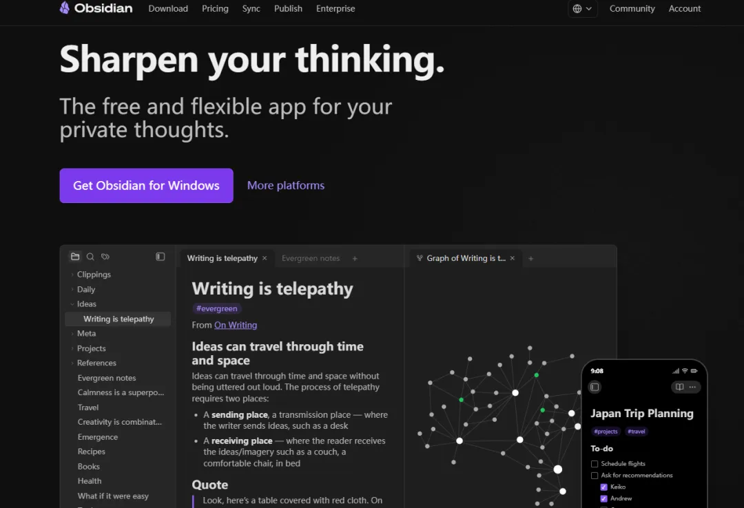 核心功能:笔记间双向链接,构建个人知识网络;配合Memory GPT等插件,自动生成笔记摘要和关联;适合长期学习者,笔记越积累越有价值
