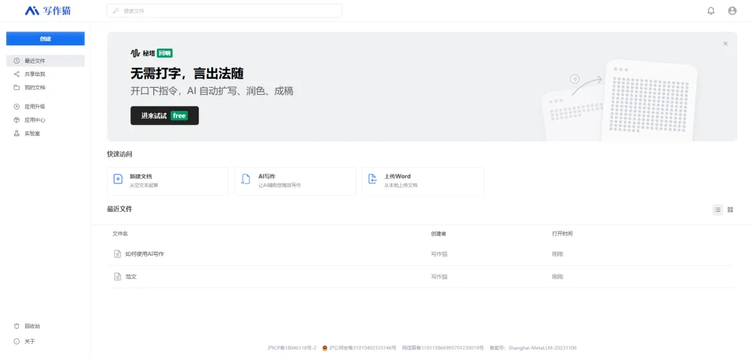 核心功能:文章润色、错别字检查;一键生成大纲和段落;支持学术/公文/日常等多种语体