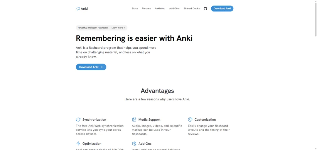 核心功能:间隔重复算法(SM-2)自动安排复习;支持图文音频卡片;海量预制卡组共享(如医学、法律、语言)