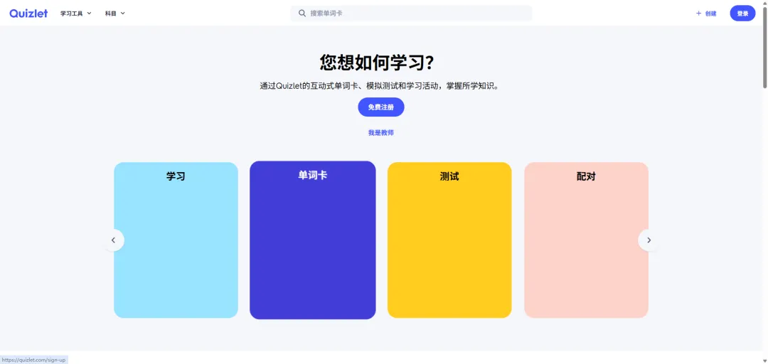 核心功能:AI根据内容自动生成学习集;多种练习模式(配对、选择、书写);与同学共享学习集