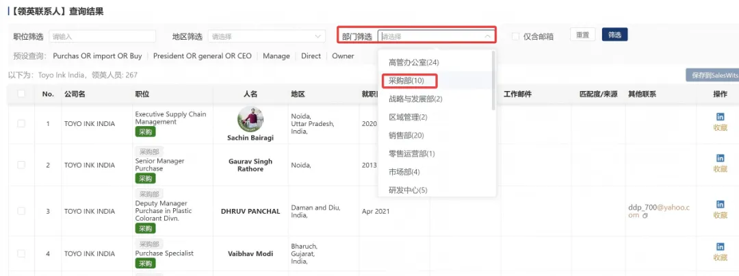但是啊,有个问题,这些插件虽然厉害,但是你得先有目标人物的领英链接才能用,对吧?这时候就不得不请出我的秘密武器了——环球慧思Gtis 6.0系统里的环球搜,特别实用和高效!你只需要输入目标公司名字,环球搜一键帮你找出:这家公司有哪些部门?每个部门关键联系人是谁?他们的领英链接也直接给你列好!比如你想找采购部,就直接筛选采购部,然后点击联系人右侧的领英标识,复制粘贴链接,就能进入这个联系人的领英主页面。然后再用插件去抓取邮箱,精准度直接拉满!