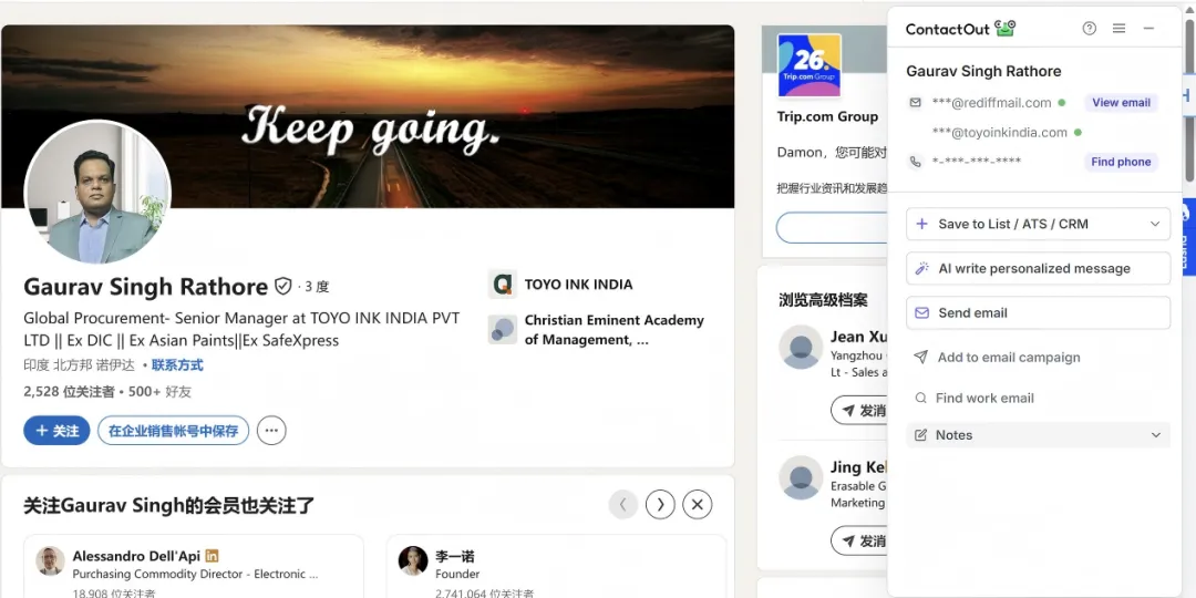 有领英想找关键人,那就先环球搜拿链接,再用Contact out、SignalHire抓邮箱;
