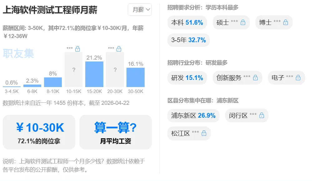 据职友集的数据显示,上海地区的软件测试工程师,薪酬区间在3-50K,其中72.1%的岗位月薪都在10-30K,折算下来年薪就是12-36W,这还是大部分普通从业者的水平。