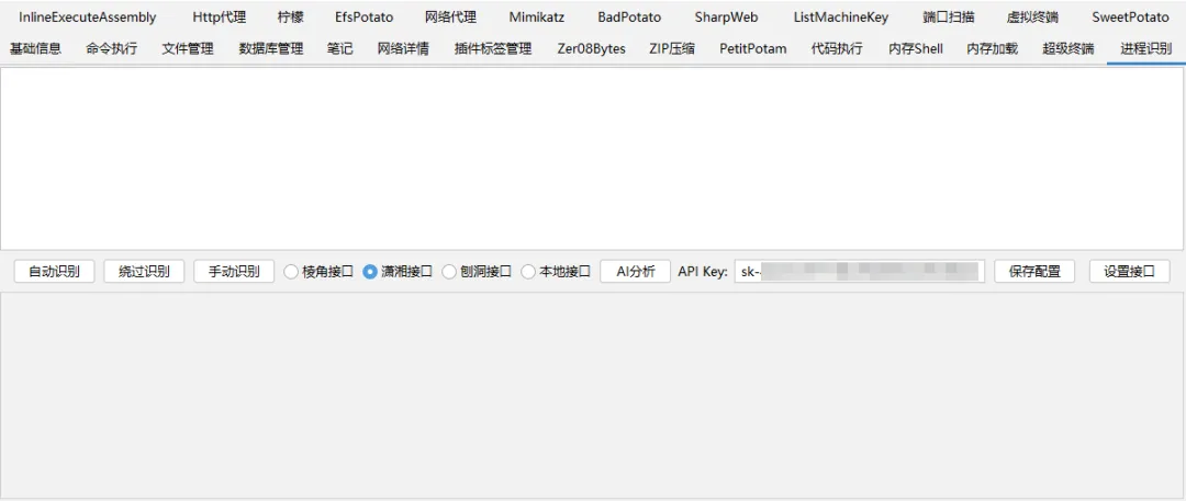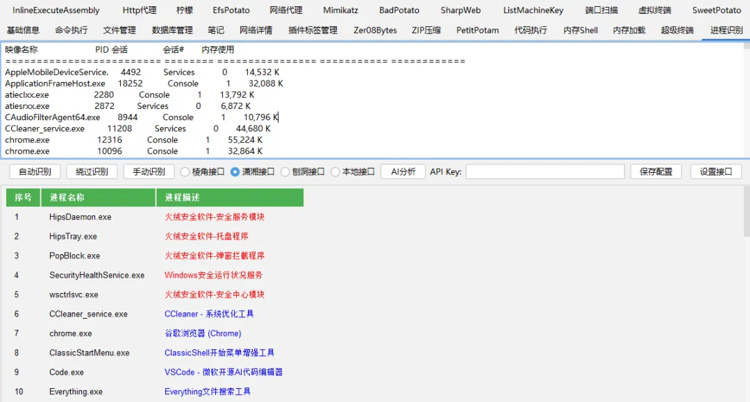 支持版本:哥斯拉 V4.0.1、哥斯拉特战版;集成接口:棱角接口、潇湘接口、刨洞接口、本地接口;识别方式:自动(tasklist)、绕过(bypass)、手动识别;支持脚本:ASP、PHP、.NET、JSP等Webshell以及数据库Shell;进程格式:tasklist、cs/msf、wmic、powershell等多种进程格式;AI 分析:整合DeepSeek API,提供专业的红队评估视角分析进程;设置接口:可同时设置DeepSeek API和潇湘信安API保存到配置文件;