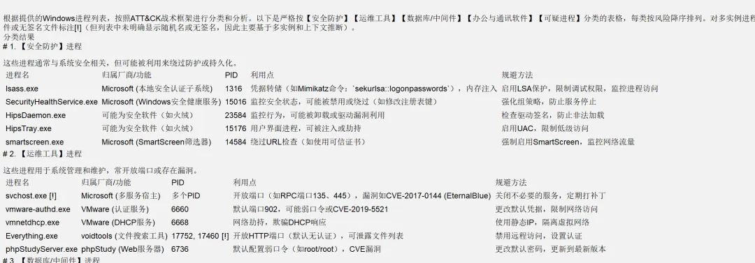 1、修复原版必须Ctrl+a & Ctrl+c & Ctrl+v才能获取匹配结果(已修复)2、PHP绕过识别获取进程列表乱码 - tasklist.php编码问题(已修复)3、PHP个别环境无法执行tasklist - tasklist.exe路径问题(已修复)$command = 'C:\\Windows\\System32\\tasklist /FO CSV /NH';4、刨洞接口无法识别notepad++.exe进程 - URLEncoder编码问题(已修复)URLEncoder.encode(modifiedTaskListText.toString(), "UTF-8")5、潇湘接口无法识别带一个或多个空格的进程 - \\s+正则拆分问题(已修复)String[] trimmedLine = line.trim().split("\\s+");6、潇湘接口不支持大写.EXE或存在多个.exe被截断 - 大写和截断问题(已修复)trimmedLine.toLowerCase(Locale.ROOT).lastIndexOf(".exe");测试进程:CMFNSS6.EXE、MSIP.ExecutionHost.exe、MSIP.ExecutionHost32.exe7、手动识别有6个绿色进程会插入在紫色进程中间,color颜色提取问题(已修复)if (match.contains("<font color=green>")) return "green"; // 要用完整标签提取8、修复刨洞接口无法正确识别CS和MSF进程列表格式问题 - 改用正则匹配(已修复)[\w\u4e00-\u9fa5.\-+()]+\.exe\b // 无法匹配到带空格的进程名[...SNIP...]