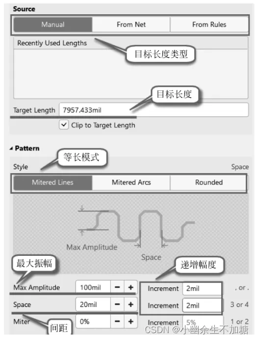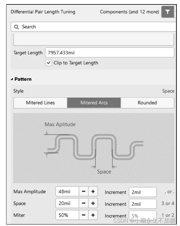 Space 指的是蛇形线之间的距离,单端等长默认设置3W,差分通常是设置20mil以上的一个间距,递增幅度建议改为2mil;