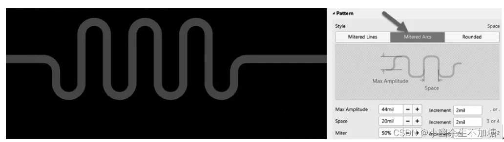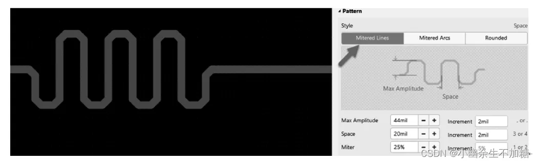 Miter是指蛇形线斜角的一个角度, 设置30%就可以了。