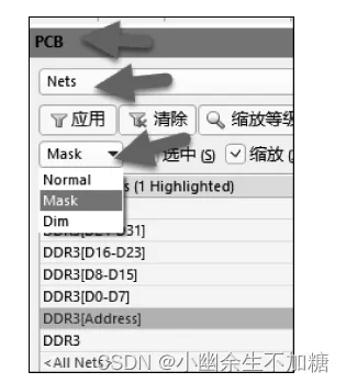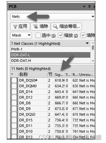 点对点的等长较为简单,只需在 Nets 中查看长度,参照组内最长走线进行等长即可,如图所示。若主控和 DDR 之间有排阻,如图所示。等长时可备份一个原理图文件,然后修改原理图,将电阻两端短接,导人PCB中,即可按点对点的方式等长。等长完成后,再把备份的原理图加到工程中,重新导入 PCB。注:在进行等长操作时,可使用 PCB 面板中的筛选工具,选择 Mask 或者 Dim 模式,可进行高亮操作,如图所示。