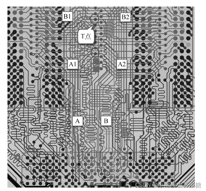 T 型等长,简易结构如图 所示。实际上就是让 CPU 到每一个 DDR 的走线长度相等,T点两边的分支走线要求尽可能短,长度尽可能相等,如图所示。实现A+A1=A+A2=B+B1=B+B2。