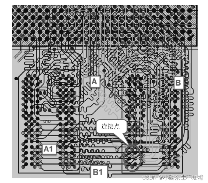 菊花链的结构相对比较简单,阻抗也比较容易控制,其简易结构如图 所示。从图中可看出,信号是在相邻两个元件之间进行传输的,从 CPU 到第一片 DDR,再到第二片 DDR。实际连接图如图 所示,实现 A=B,A1=B1。
