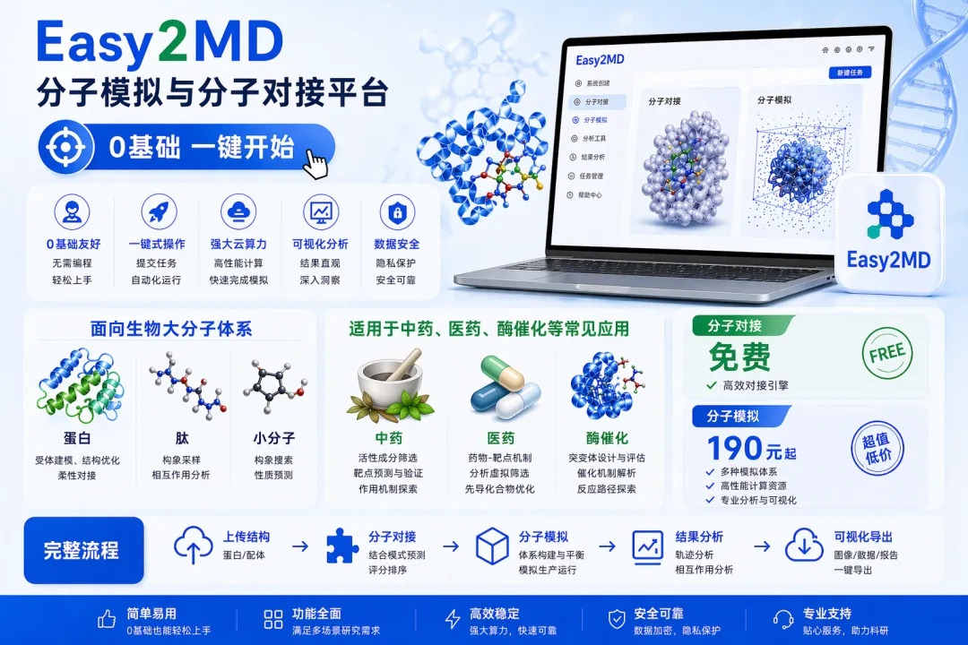 如果你有靶点、有候选分子,却卡在如何进一步提升层级,分子对接+分子动力学就是现在的黄金搭档。小张这里有成熟服务器和对接流程——easy2md平台,可以快速完成结合模式预测与亲和力评估,协助你把文章再往上推一档。