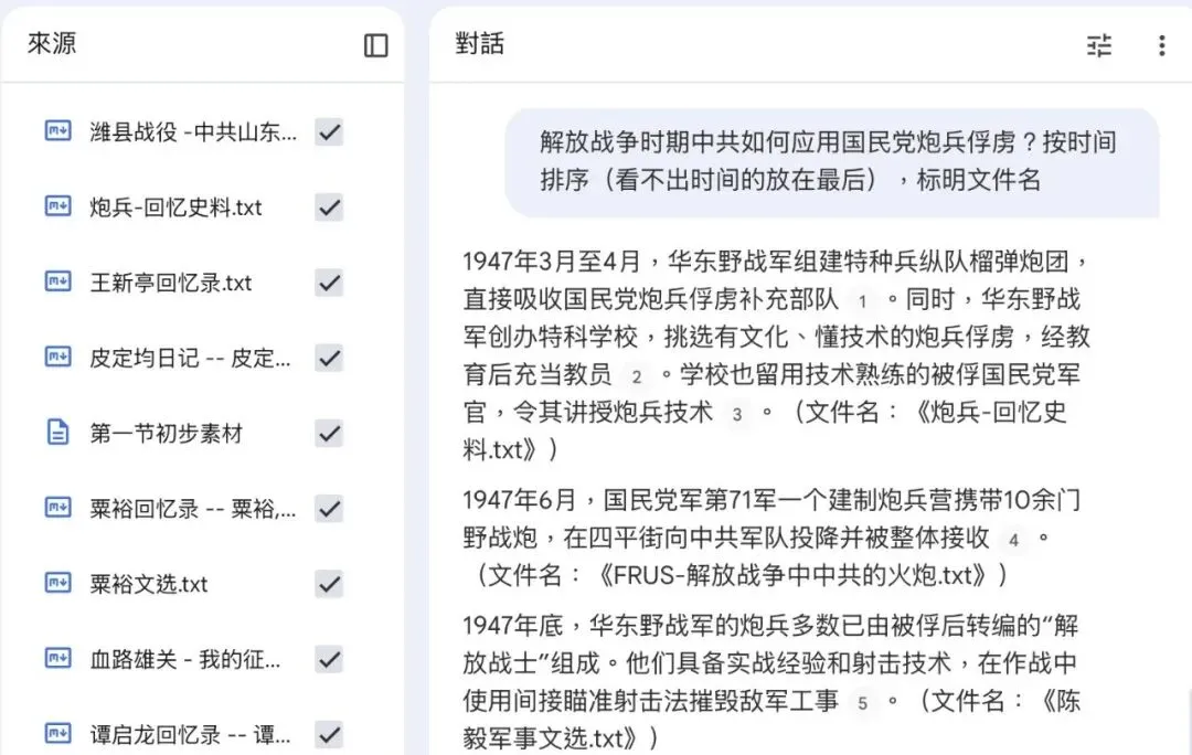 询问助理同学自建的解放战争主题谷歌Notebook LLM知识库
