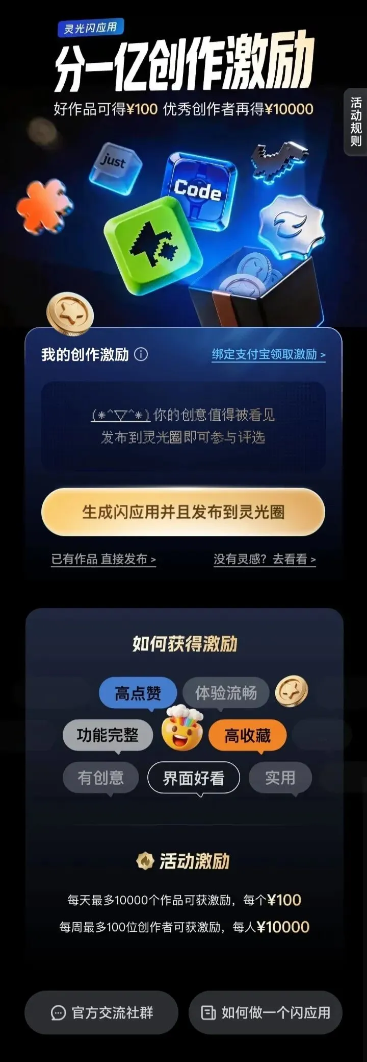 我发现最近灵光在搞一个分一亿创作激励的活动,只要用它来做闪应用,就可以分现金奖励,活动的详情是这样的。