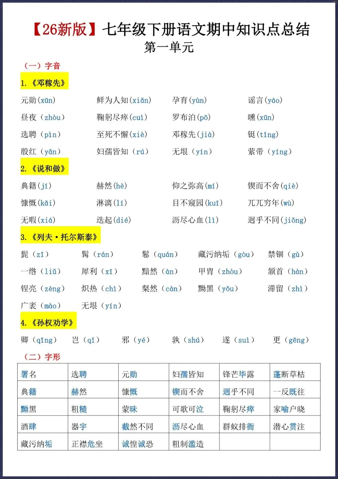 七年级语文期中考试即将来临,知识点散乱、背诵没有重点、文言文容易搞混?新版七年级下册语文期中知识点总结可以算得上是备考神器,能够使学生们有效地把分数保住,轻松迎战考试!