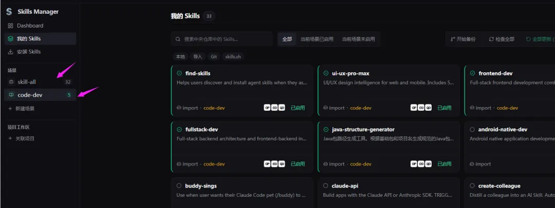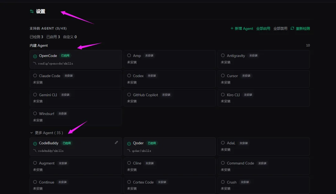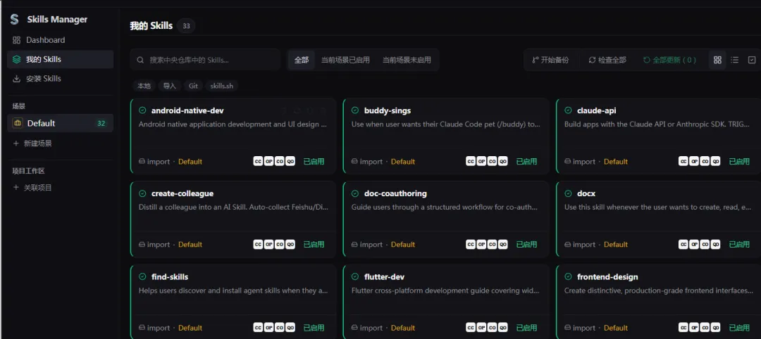 比如我一共导入了32个Skills,我并不想所有的客户端都可全部使用一样的。opencode客户端日常做一些繁琐的任务,可以使用所有的skills,但是Qoder和CodeBuddy用来日常Coding,只想用一些前端设计、后端设计的Skills。我们就可以通过场景区分。