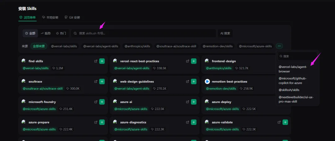 可以直接搜索skill安装。这里收录了众多的skills库。