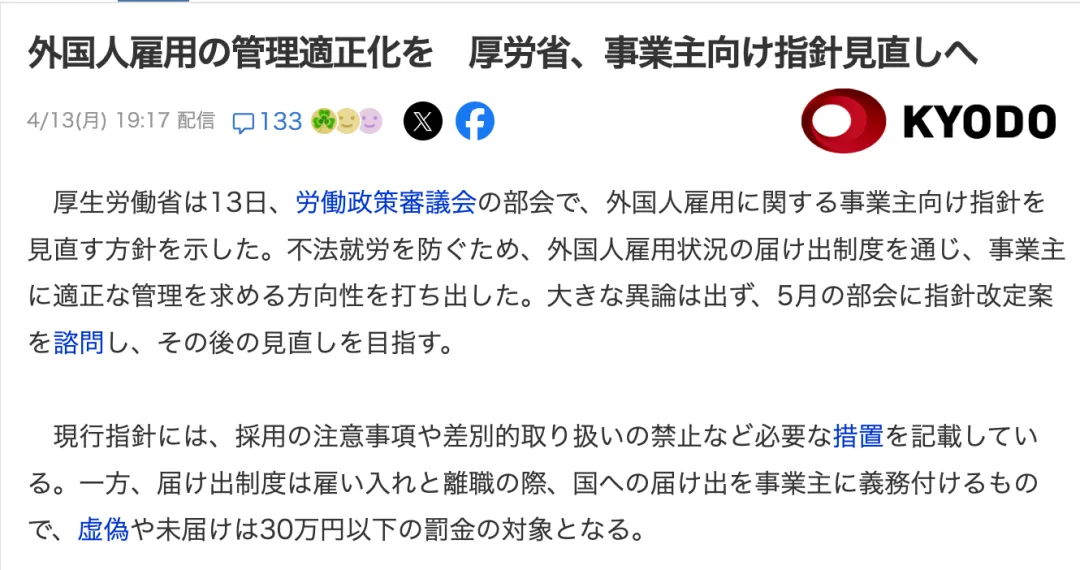 按照规定,企业在雇用或解雇外国员工时,必须向政府完成申报;若存在未申报或虚假申报行为,最高将面临 30 万日元罚款。尽管这项规定早已出台,但此次官方明确提出要 “加强宣传与执行力度”,预示着后续相关核查会更加严格。