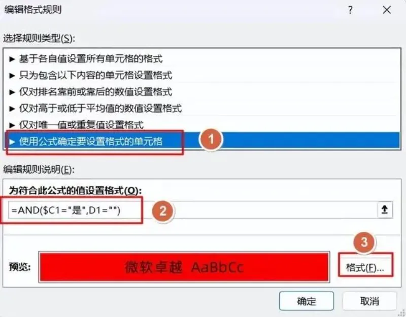 =AND($C2="是",D2="")(这个公式像小侦探:$C2固定看C列对应行是不是“是”,D2看当前行D列是不是空,两者都满足就提醒)