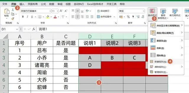 点击Excel顶部菜单栏的【开始】选项卡→找到【条件格式】按钮(在字体组附近)→下拉菜单选【新建规则】→再点【使用公式确定要设置格式的单元格】。