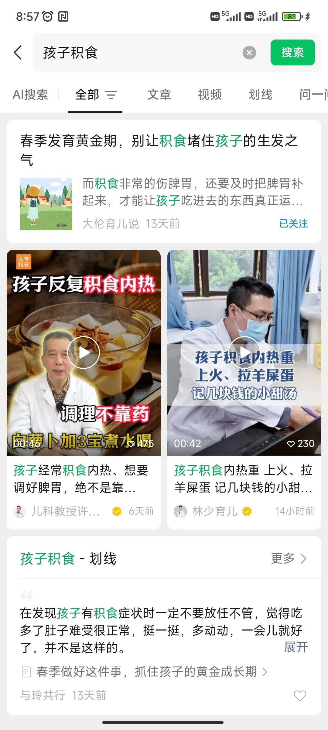 不知道妈妈们平常对育儿有疑问的,实在哪里搜索的,我比较喜欢微信上搜索,因为有很多高质量的文章。比如“孩子积食”,既有我经常看的文章,还有一些“视频号”。