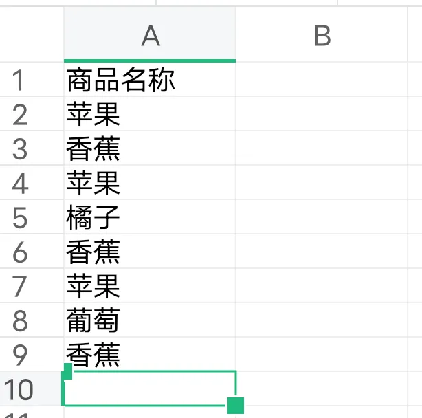 我们要统计”香蕉”出现了多少次,公式就是=COUNTIF(A2:A9,”香蕉”),如果要统计”苹果”出现了多少次,那就是COUNTIF(A2:A9,”苹果”)。