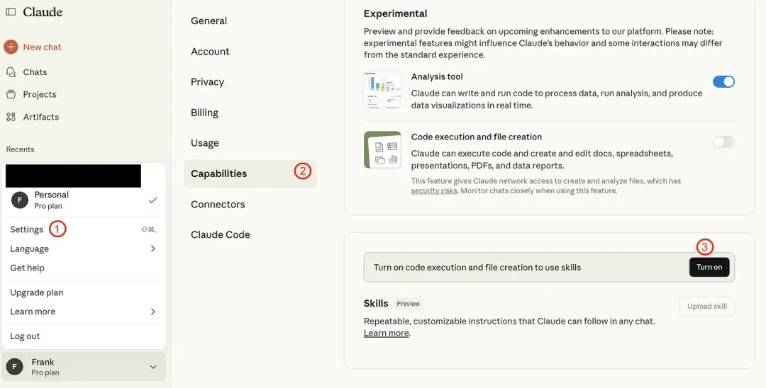按原文的顺序,先别急着装一堆 Skill,第一步是把功能开起来。路径很直接:Settings → Capabilities → Turn on Skills。从界面图看,Skills 目前还和“代码执行与文件创建”能力绑得比较近,意思也不难理解:很多 Skill 不只是回答问题,而是真的要帮你生成文档、表格、PDF、演示稿这些交付物。