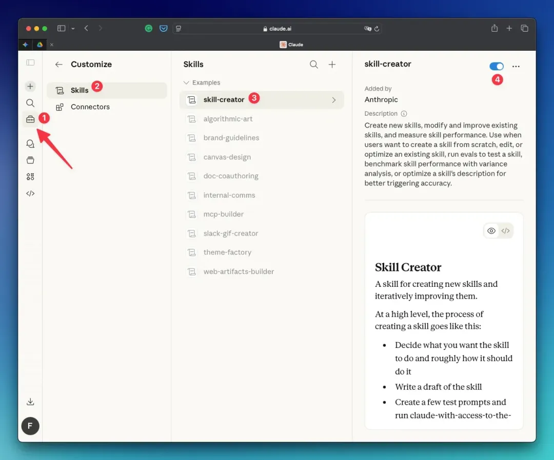 第二步是把 skill-creator 打开。原文特别提了一点:你不需要会编程,也能创建 Skill。Claude 自己就内置了一个 Skill Creator,作用很像“让 Claude 帮你给 Claude 写说明书”。如果你已经在某类任务上摸到规律,比如固定的汇报格式、固定的研究框架、固定的品牌规范,这个功能就是把这些经验沉淀下来的入口。