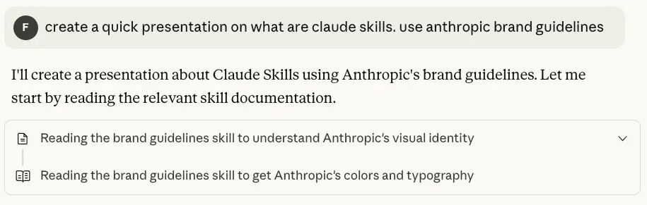 真正有意思的是第三步:Skill 不一定非得手动点选。原文给的例子是打开 brand-guidelines 之后,直接输入一句自然语言:create a quick presentation on claude skills. use anthropic brand guidelines。这张图里能看到,Claude 收到请求后并不是立刻开写,而是先提示自己在读 brand guidelines 相关文档,再去抓颜色和字体规则。