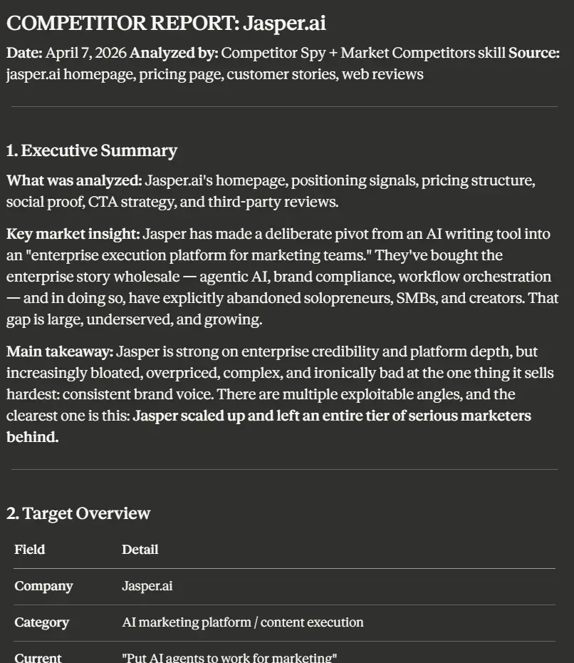 这张图能更直观看到它的样子:不是“给你几条搜索结果”,而是直接给出 Executive Summary、关键市场洞察和目标概览。对大众用户来说,这类 Skill 真正省下的不是搜资料时间,而是把碎信息压缩成可参考格式的时间。