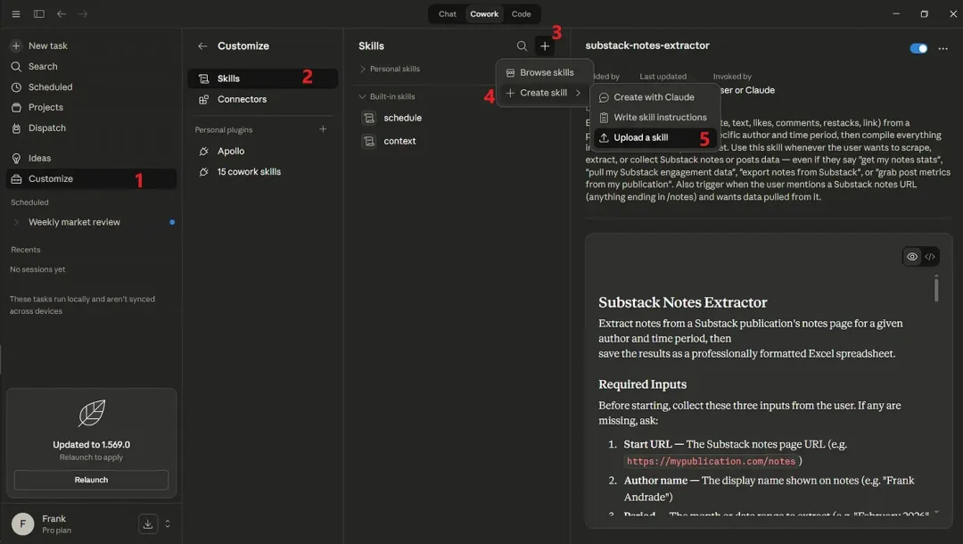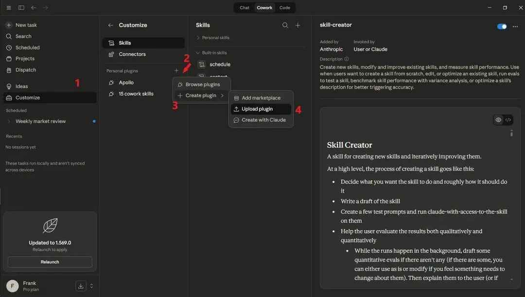 如果一个压缩包里装的是多个 Skills,原文建议走插件路径:Customize → Personal plugins → “+” → Create plugin → Upload plugin。翻成人话,就是“单个技能单独装,一整盒技能按插件装”。两条路径看似只是菜单不同,背后对应的是两种组织方式:一个是单能力复用,一个是成套工作流复用。