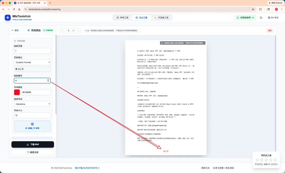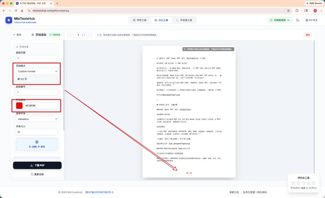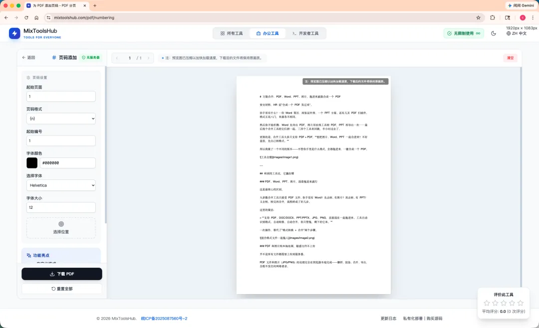 而且大多数工具的页码只能放在”页脚居中”这种固定位置,想换个地方?不好意思,不支持。格式也就”1, 2, 3″一种选择,想写”第 X 页 / 共 Y 页”?做梦。更别提很多还要把文件传到服务器上——加个页码而已,至于吗?