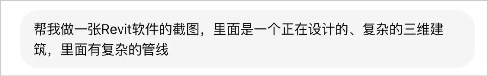 诺,我的提示词,就下面这一句,我不需要告诉他什么是 Revit,复杂建筑和管线是什么意思,一句话,生成一张图。