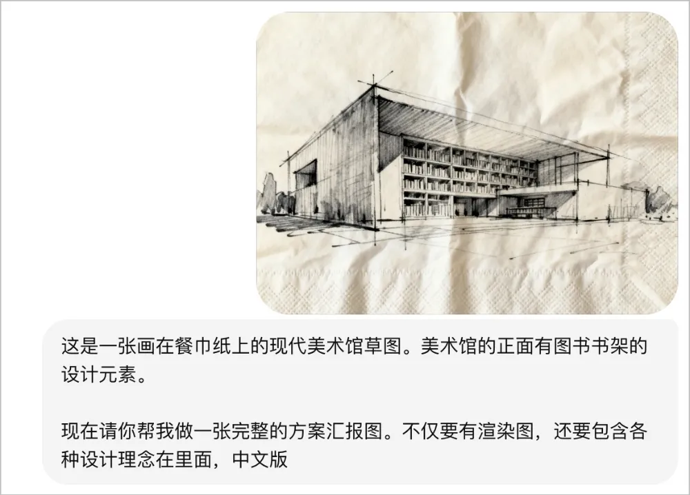 我给了他一张画在餐巾纸上的草图,只给了他两条线索:这是个现代美术馆,正面有图书书架的设计元素。
