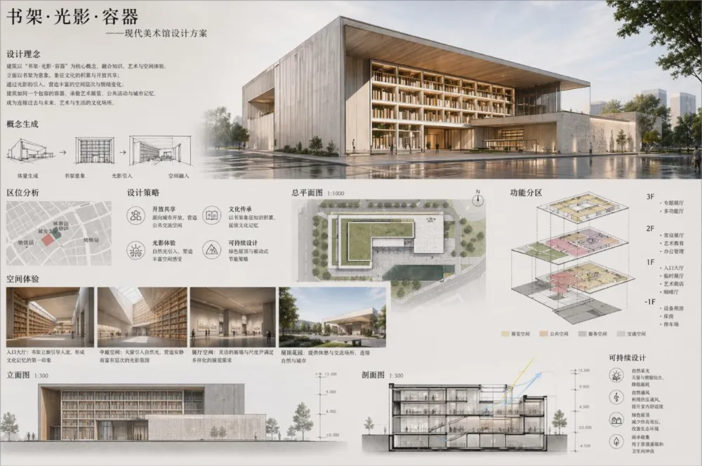 注意,我不是让它生成单张渲染图,而是要让它再没有任何信息输入的情况下,做一个完整的方案汇报图,来看看成果: