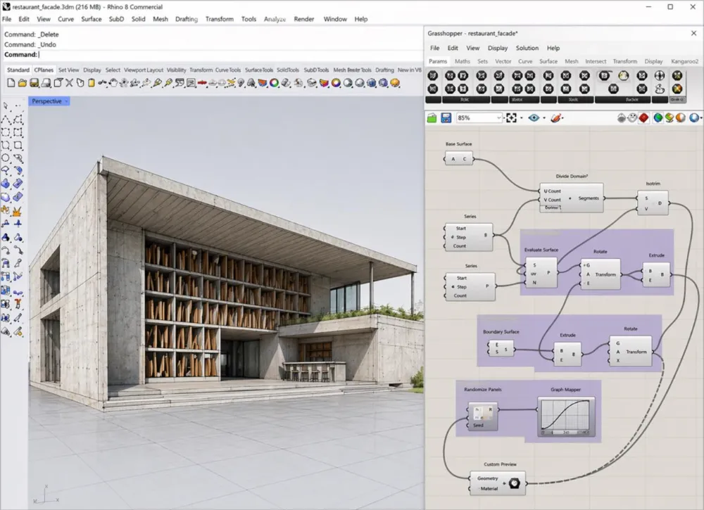 不仅 Rhino的软件界面给做出来了,项目看着也是那么回事儿,它居然还像模像样做了个Grasshopper的节点图在里头。