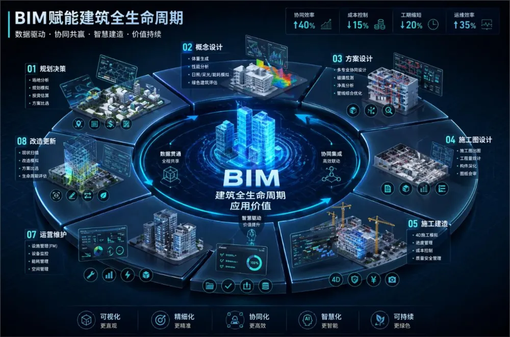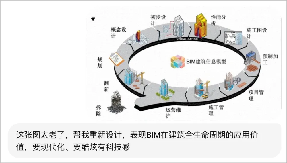 聊到汇报,我就突然想到那张 BIM 行业万年不变的图,实在是有点太老了,于是就扔给image2,让他帮我重新设计,要求就是现代化、有科技感。