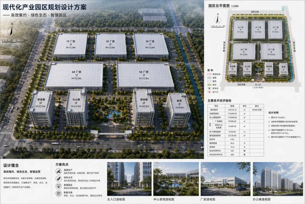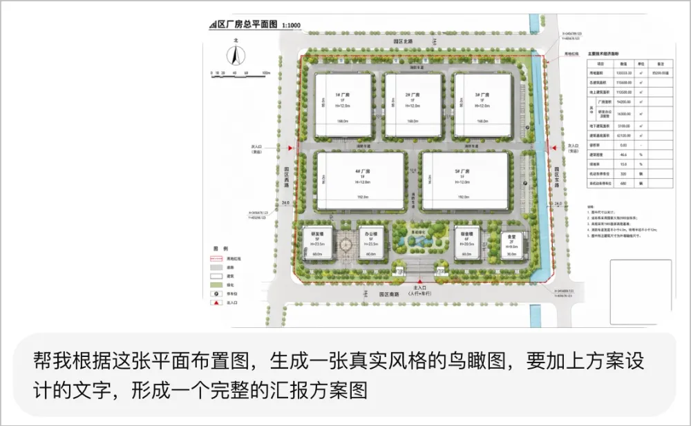 我找了一张园区厂房的总平图扔给了 image2,提示词依然很短:「帮我根据这张平面布置图,生成一张真实风格的鸟瞰图,要加上方案设计的文字,形成一个完整的汇报方案图」。