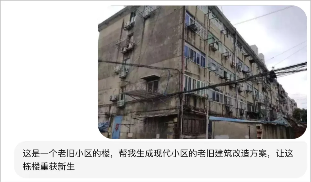 再看下面这个,我只是告诉它这是一个老旧小区的楼,让它帮我生成一个现代小区的老旧建筑改造方案。