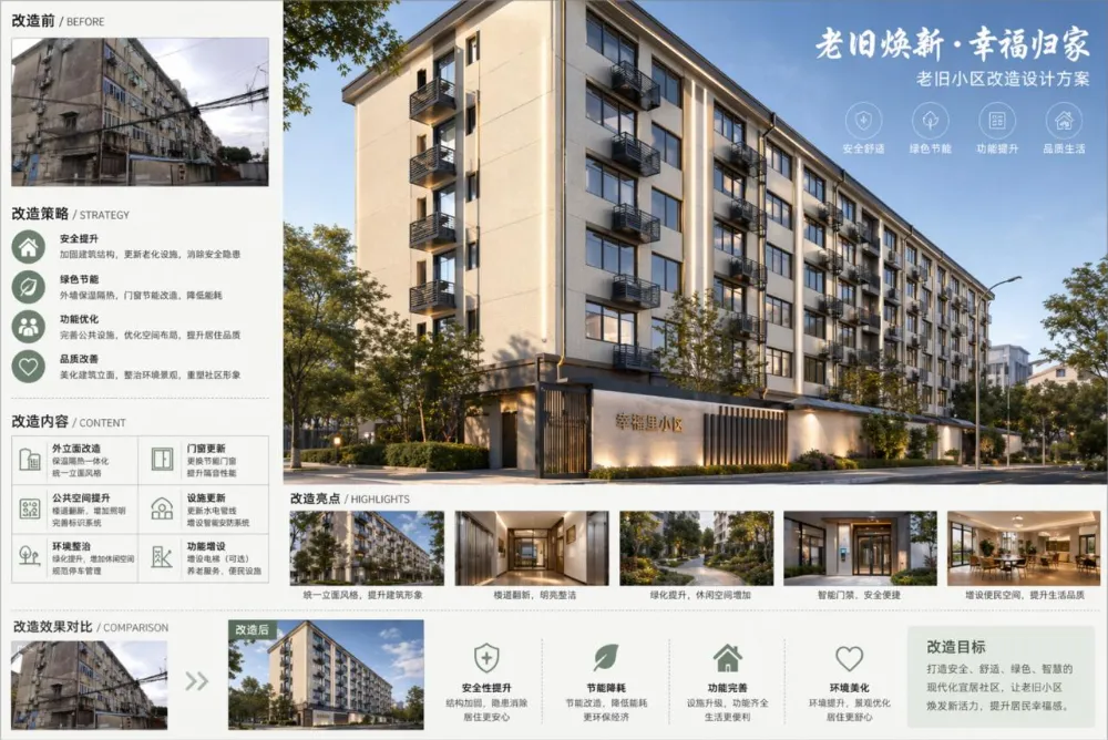 这里的世界知识又起作用了,它需要知道「老旧建筑改造」意味着什么,不仅有传统的安全提升、品质改善、设施更新,还得有最近主流的节能降耗、绿色智慧,做了新的效果图就不用提了,连汇报风格的主题色都是绿色。这一切都不是我给的提示词。