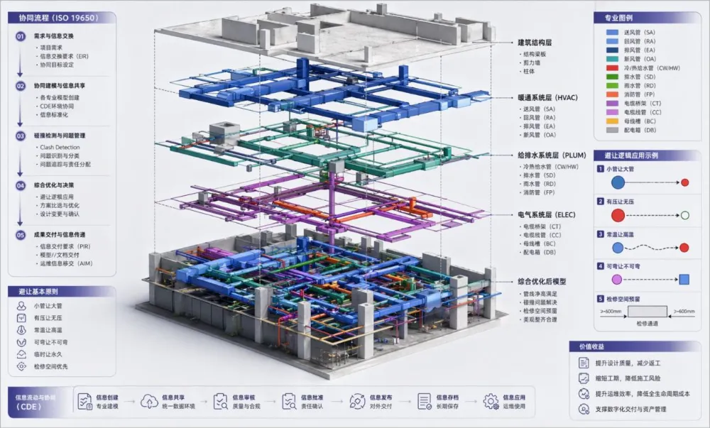 出来的方案比建模软件截图漂亮多了,它还考虑加入了避让逻辑和原则、符合ISO 19650标准的设计流程。