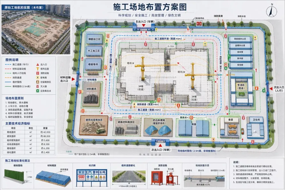 下面这个图,只有左上角的原始工地航拍图是我给的参考图,我让它基于这个工地,帮我做一份施工场地布置方案。
