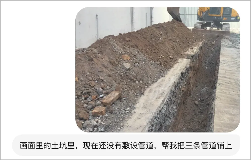 没事儿,咱们补充提示词,让它把管道做旧,最好在上面蒙上半层土,再看看结果。