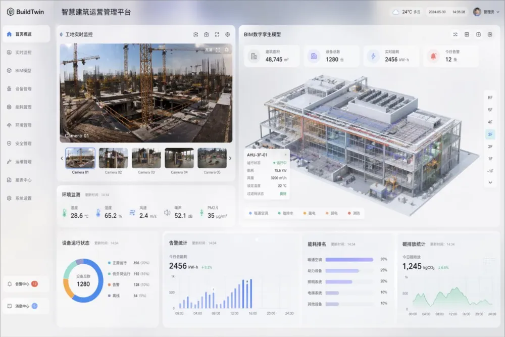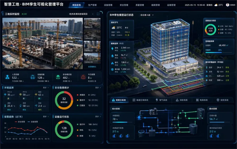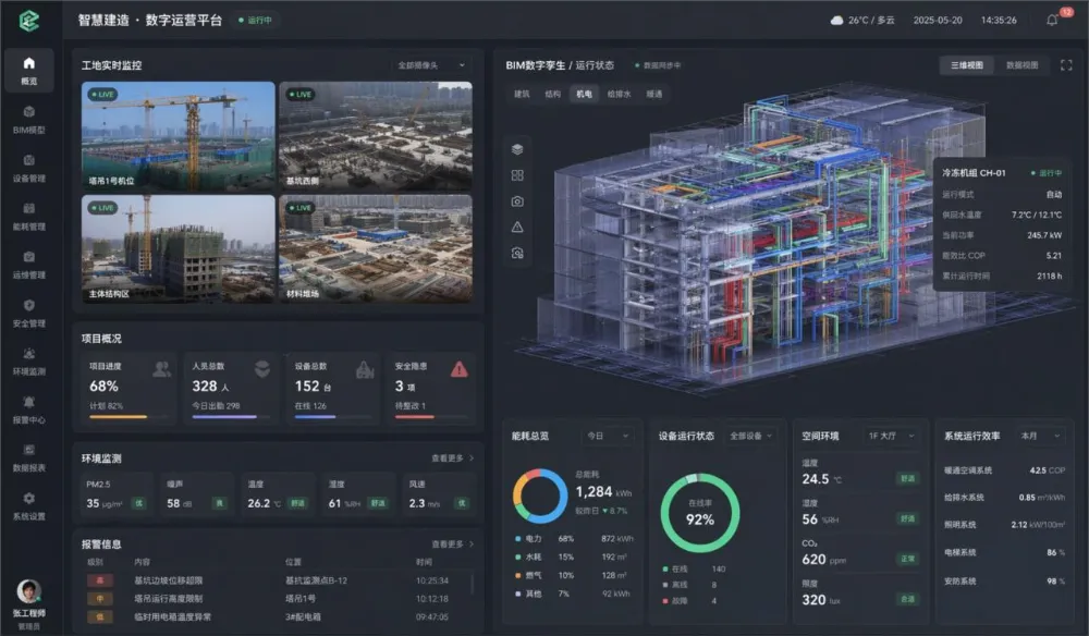 甲方肯定会提意见,比如「要把分页在左侧竖排,左侧是真实工地监控,要分成多个视角可切换,右侧是BIM孪生模型,甲方看腻了蓝色风格,换一个灰色的」,于是2分钟之后,你就能得到这张图: